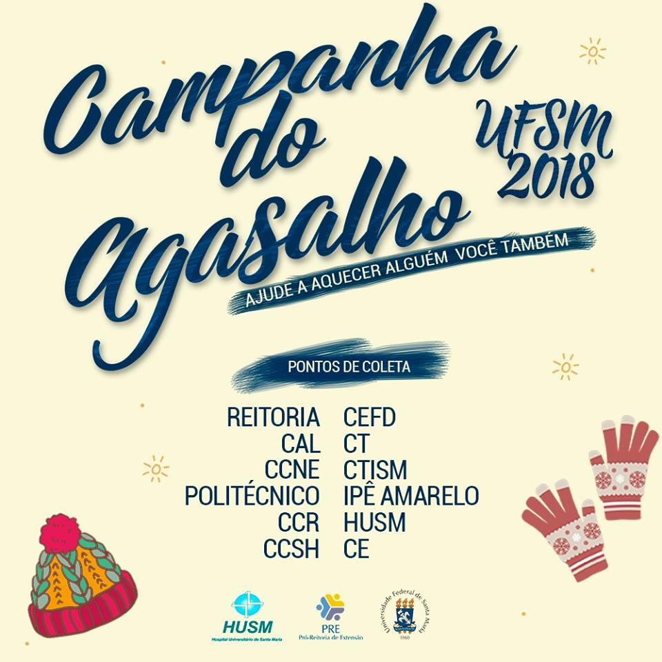 A PRE – Pró-Reitoria de Extensão da UFSM, através da Coordenadoria de Cultura e Eventos, promove, a partir do dia 18/06, a Campanha do Agasalho UFSM 2018, que se estende até o dia 15/07. Confira os pontos de coleta: