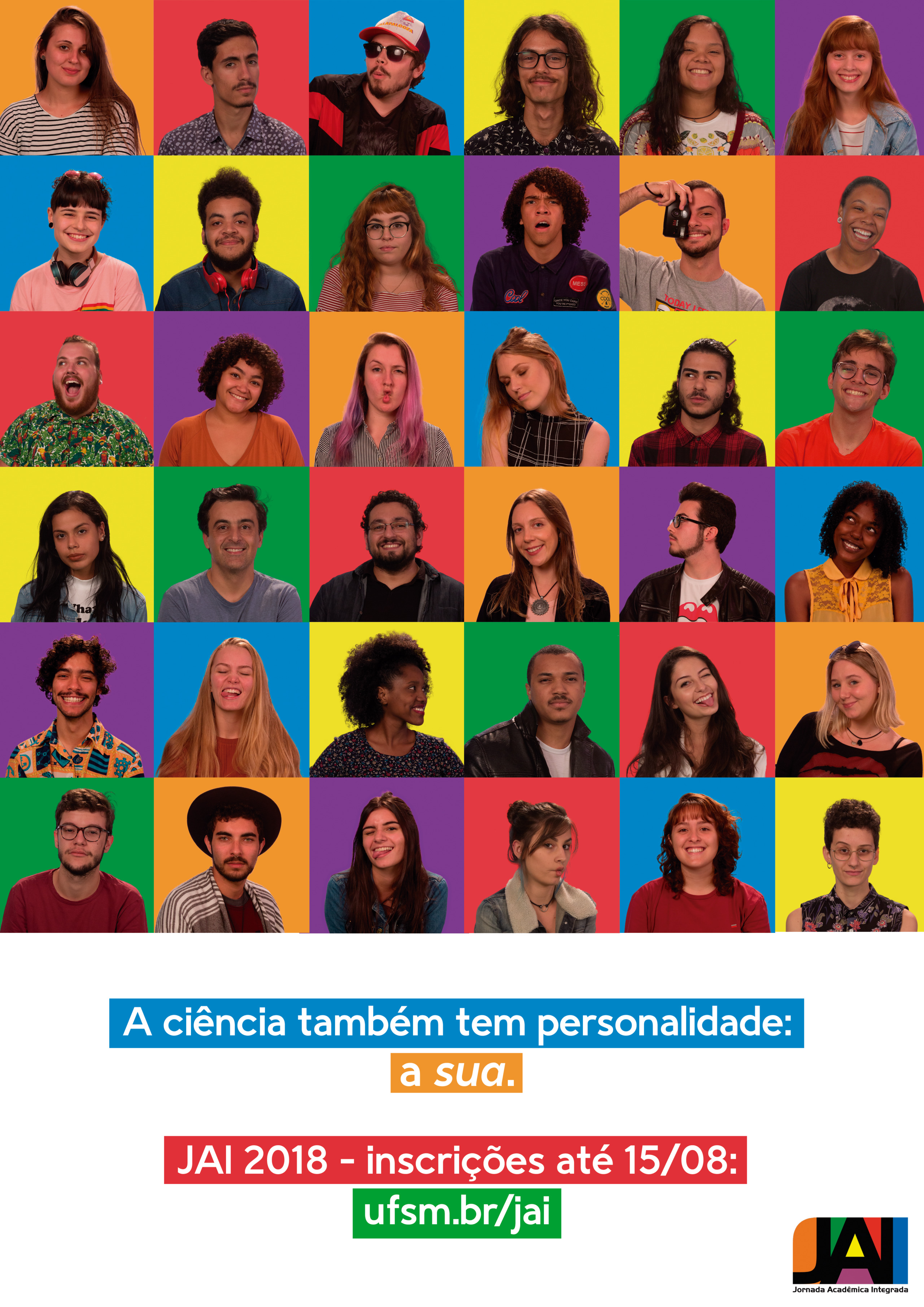 “Sabendo que a Jornada conta com mais de 5 mil trabalhos todos os anos, nós construímos a campanha tentando representar essas muitas personalidades que compõem o evento através das fotos que são ‘a cara’ da campanha”, aponta Amanda da Cas, uma das responsáveis pela campanha. A identidade visual da JAI 2018 utiliza seis cores em todas as peças como forma de construir, gradativamente, uma identidade para a Jornada que seja mais palpável e que converse melhor com seu público.