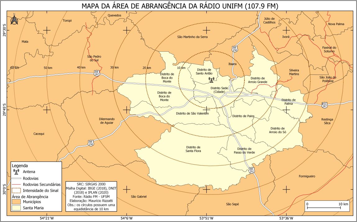 A 107.9 FM, emissora da Universidade Federal de Santa Maria vinculada à EBC, mantém uma potência permanente de 280 watts. As transmissões alcançam principalmente o município de Santa Maria, com pelo menos 283.677 habitantes, segundo o IBGE para 2020 (Fonte: IBGE – Estimativas Populacionais: Tabela 6579 – População residente estimada [Sistema IBGE de Recuperação Automática – SIDRA]). A antena da FM está instalada em uma torre de 50 metros localizada no Morro das Antenas, no bairro Caturrita, região norte da cidade. O sinal pode chegar a alguns municípios ao redor, como São Pedro do Sul com 16.148 habitantes (levando-se em conta registros ideais de sinal, condições climáticas e configurações topográficas).