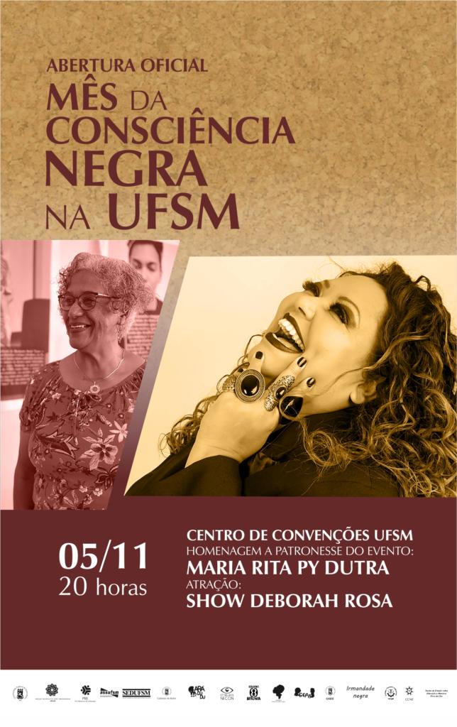 A entrada será mediada por ordem de chegada, a programação do Mês da Consciência Negra está sendo construída em conjunto com as entidades: – NEAB, PRE, Gabinete do Reitor, Coletivo AFRONTA, Dandaras, GT Negros/NECON, ASSUFSM, Irmandade Negra, Ará Dudu, Povo de Clio, ATENS, CAED, CTISM, CCNE.