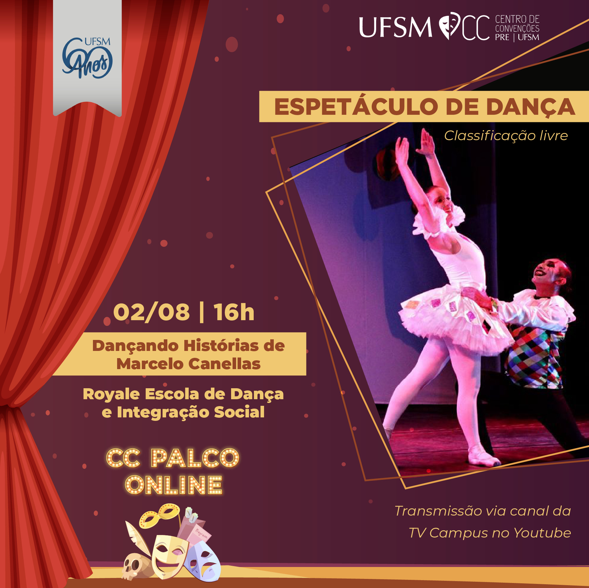Abrindo a programação de agosto do projeto CC Palco Online, o Centro de Convenções da UFSM recebe, excepcionalmente, no próximo domingo (02), às 16h, o espetáculo Dançando Histórias de Marcelo Canellas, produzido pela ONG Royale Escola de Dança e Integração Social. A transmissão do espetáculo, que é a única atração do projeto CC Palco Online realizada em um domingo, acontece ao vivo, através do canal da TV Campus UFSM no YouTube.