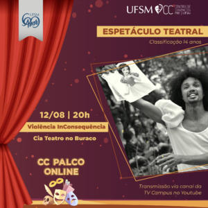 O Centro de Convenções da UFSM recebe, na próxima quarta (12), às 20h, a 6ª atração do projeto CC Palco Online, o monólogo teatral Violência InConsequência, do artista santa-mariense Gelton Quadros. O espetáculo de teatro retrata a realidade da violência familiar em dois momentos: no primeiro, uma jovem sonhadora vítima do seu príncipe encantado; no segundo, seu filho encarando uma realidade cruel, na qual também torna-se refém do sistema e da violência infantil. A transmissão do espetáculo acontece ao vivo, através do canal da TV Campus UFSM no YouTube.