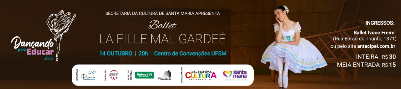 A Secretaria da Cultura de Santa Maria apresenta, Projeto Dançando para Educar no ballet de repertório La Fille Mal Gardée. Uma peça cômica e encantadora que conta a história de Lise, apaixonada pelo camponês Colas, mas prometida por sua mãe, Simone, ao ingênuo Alain, filho de um rico fazendeiro.
