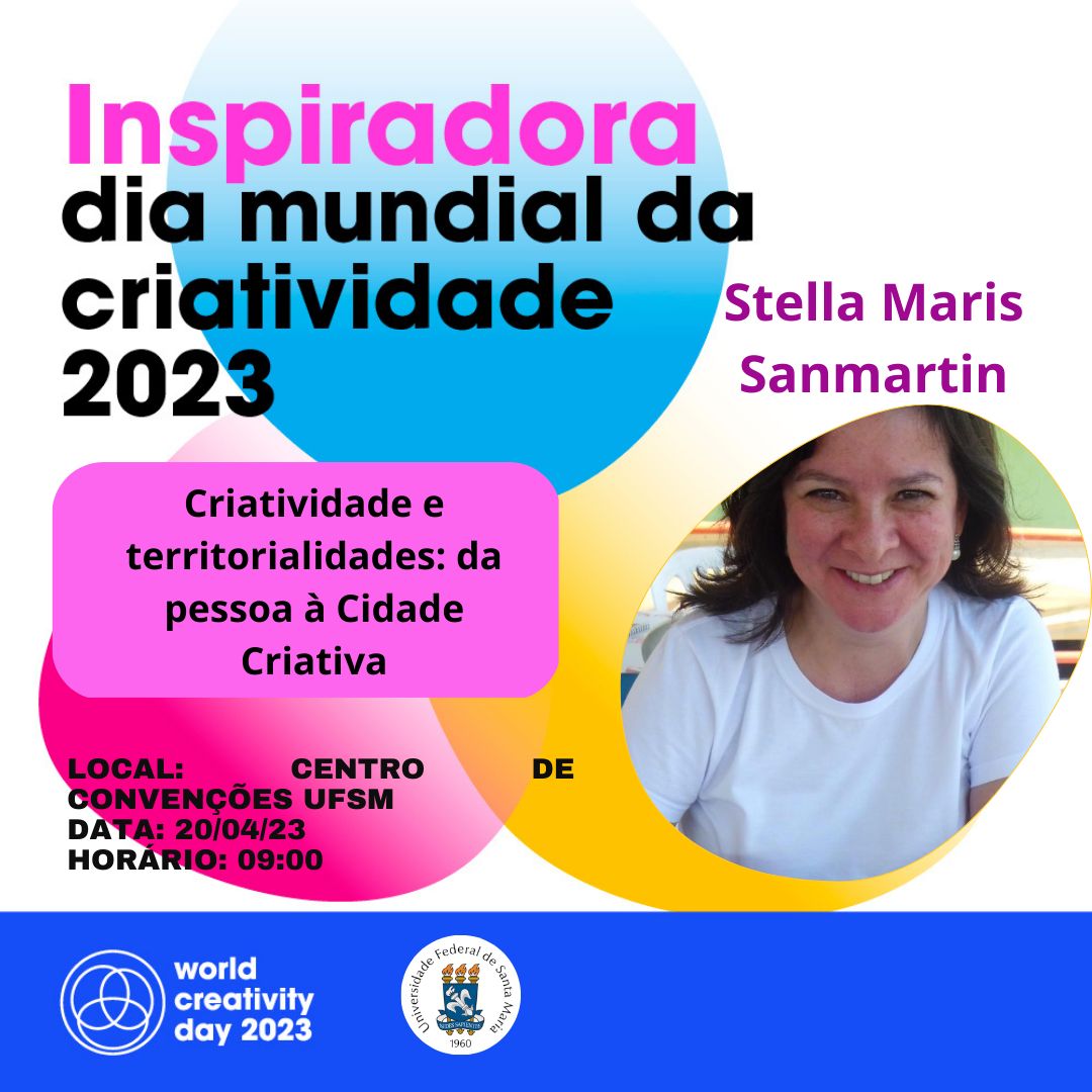 As programações do Dia Mundial da Criatividade em Santa Maria/RS acontecem a partir do 20/04/23 – 8:30. 9:00 – Palestra de abertura com Dra. Stella Sanmartin. Especialista no campo da Criatividade, Processos de Criação e Ensino de Arte. Professora adjunta do Programa de Pós-Graduação em Artes do Centro de Artes da Universidade Federal do Espírito Santo. Autora dos livros Criatividade e Inovação na empresa: do potencial à ação criadora; Criatividade nos processos de coaching e Intuição e criatividade na tomada de decisões. Inscrições no link: https://worldcreativityday.com/brazil/santa-maria/activities/processos-criativos