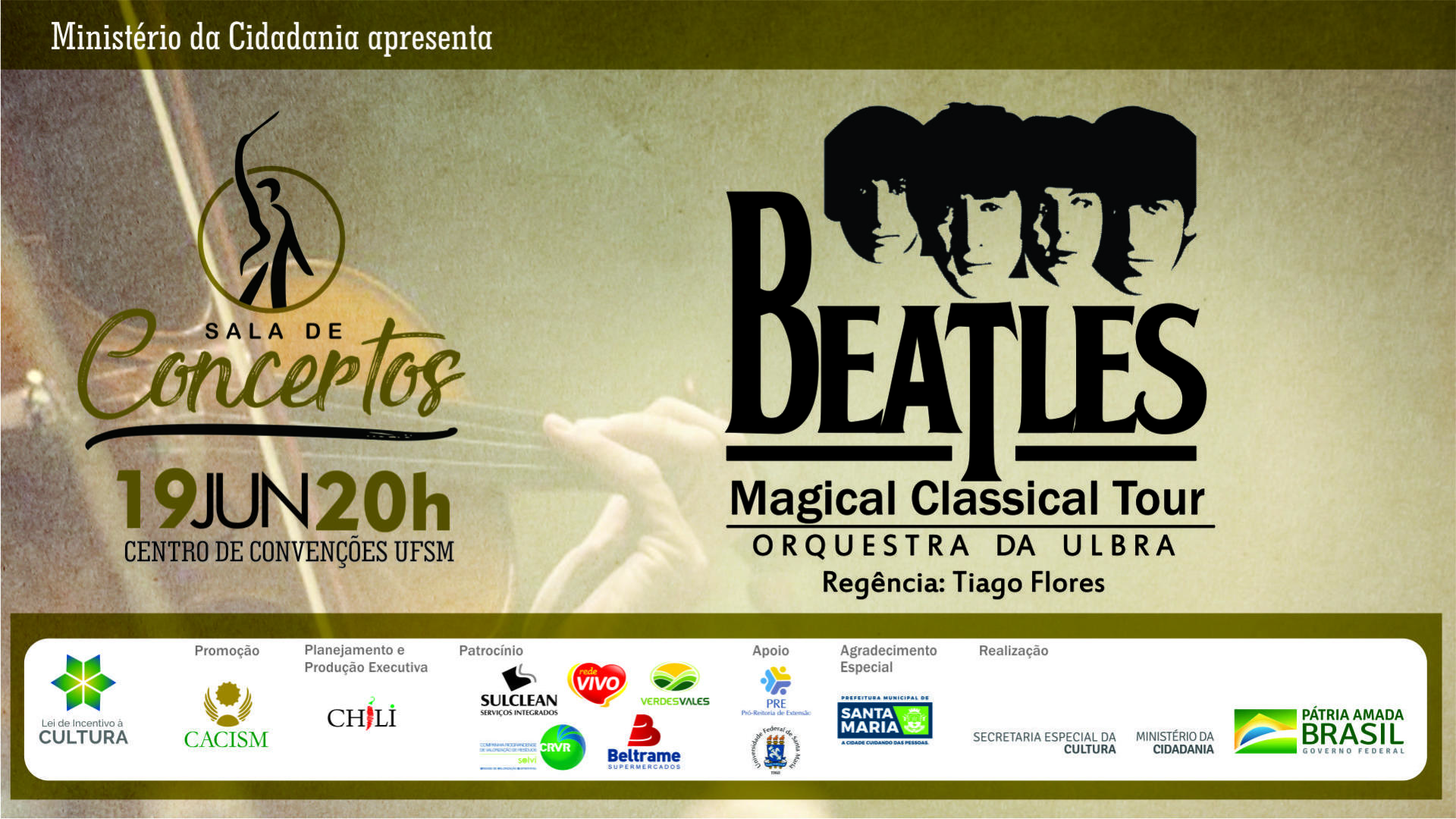 Em comemoração aos seus 122 anos, a Cacism Santa Maria apresenta a terceira edição do projeto Sala de Concertos, desta vez com a Orquestra da Ulbra e convidados tocando Beatles, no espetáculo 𝐎𝐫𝐪𝐮𝐞𝐬𝐭𝐫𝐚 𝐝𝐚 𝐔𝐥𝐛𝐫𝐚 𝐁𝐞𝐚𝐭𝐥𝐞𝐬 𝐌𝐚𝐠𝐢𝐜 𝐂𝐥𝐚𝐬𝐬𝐢𝐜 𝐓𝐨𝐮𝐫.