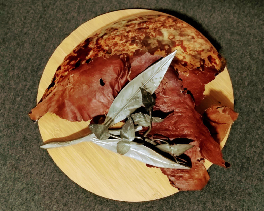 Linguagem e Técnica: Objeto/composição. Madeira, cobre esmaltado, estanho, prata e casca de árvore (resíduos).