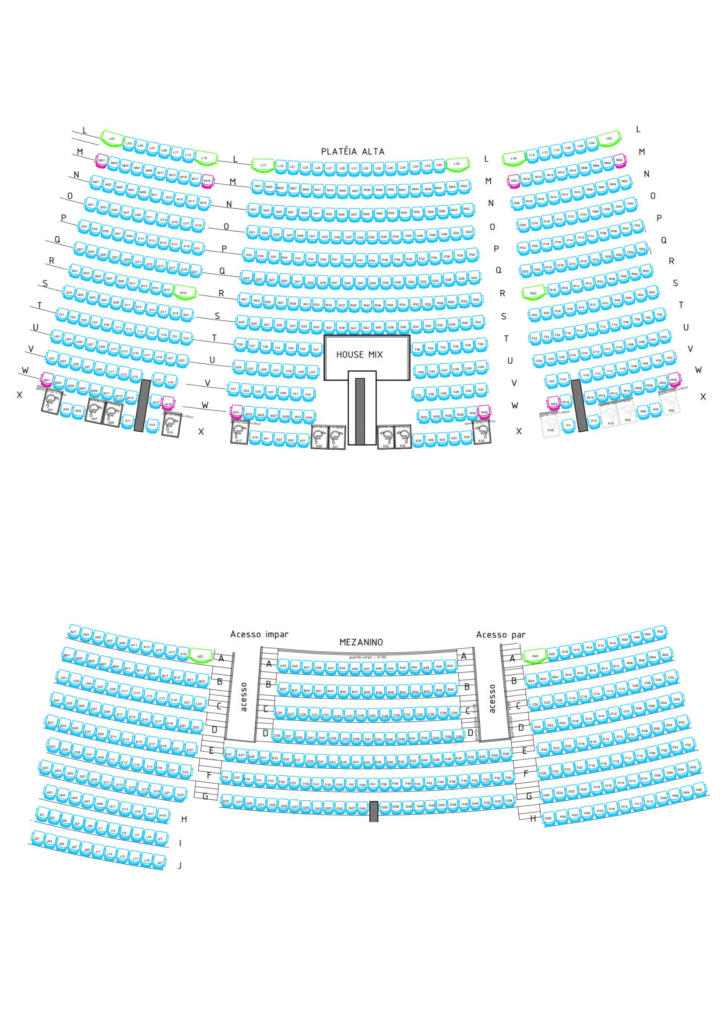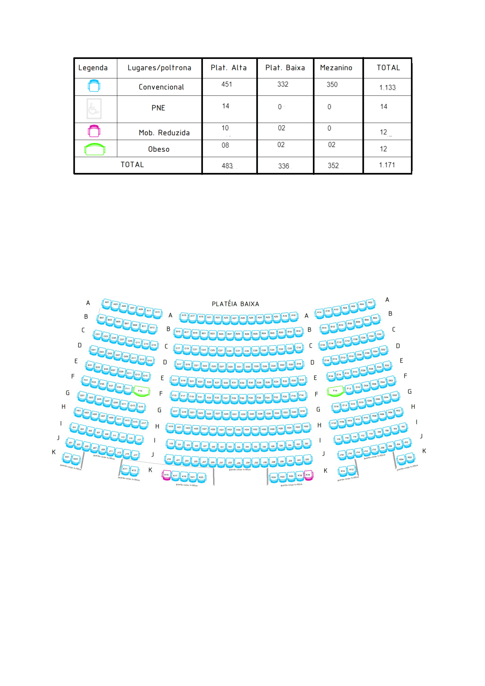 | Lugares | Plateia Alta | Plateia Baixa | Mezanino | Total |