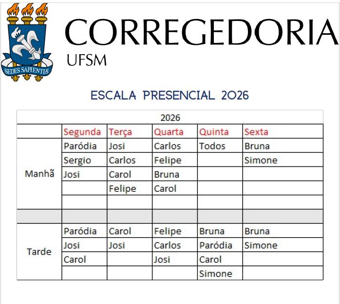 Ir para o conteúdo CORREGEDORIA - UFSM Ir para o menu CORREGEDORIA - UFSM Ir para a busca no site CORREGEDORIA - UFSM Ir para o rodapé CORREGEDORIA - UFSM