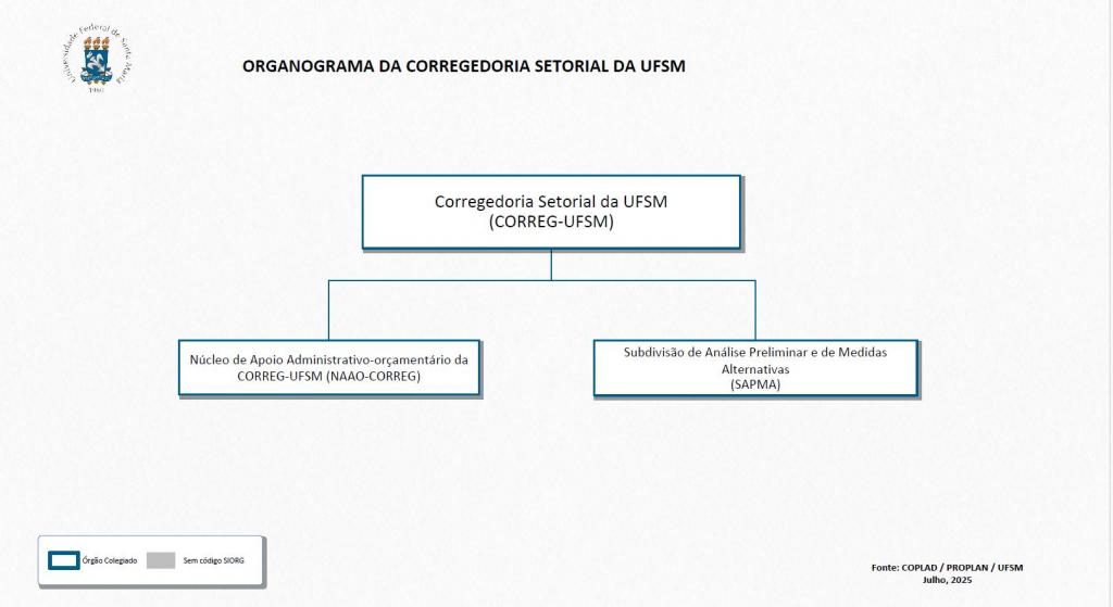 A Corregedoria Setorial da UFSM – CORREG-UFSM é um órgão de assessoramento, acompanhamento e execução de processos administrativos disciplinares oriundos dos Centros de Ensino e Unidades Administrativas, realizando também as sindicâncias no âmbito da Reitoria. A CORREG-UFSM está vinculada ao Gabinete do Reitor e visa a profissionalização da atividade processual disciplinar administrativa, bem como à centralização única das Comissões de Inquérito.