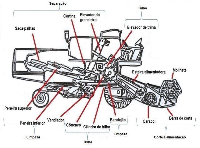 Já durante a colheita, as perdas são mais relacionadas a regulagem da colhedora. Esta é composta por três sistemas, conforme figura abaixo: o de corte, o de trilha e o de limpeza. Para que a máquina cumpra a sua função, todos esses sistemas devem estar bem regulados. Alguns fatores que levam às perdas na etapa de colheita são mais comuns.