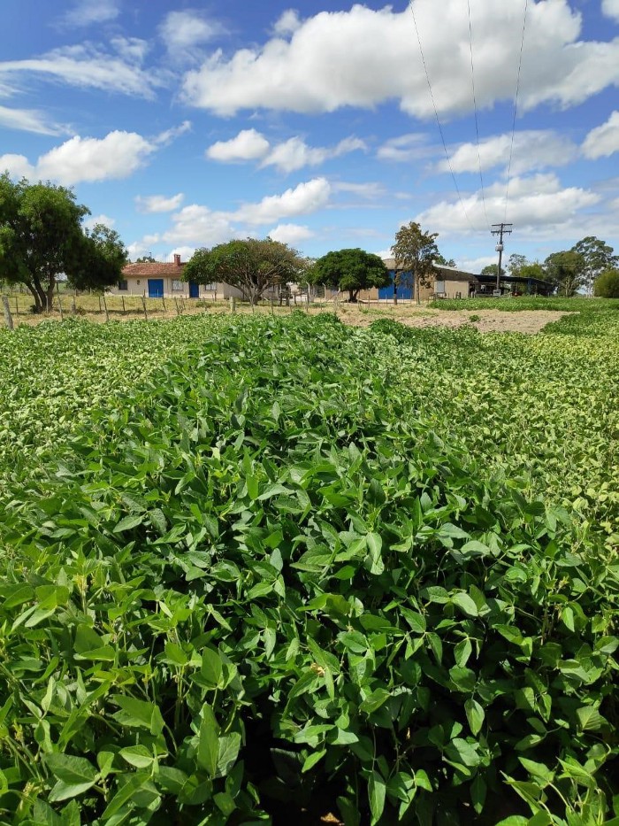 Na imagem abaixo (Figura 1), podemos notar uma linha central com plantas de soja melhores desenvolvidas, apresentando maior porte, coloração verde mais intensa e aspecto mais saudável. Isso acontece pelo fato dessa linha estar posicionada no centro de um canal que conduz o desague da calha da sede da propriedade, fazendo com que esse solo fique mais úmido, demonstrando o quanto a cultura da soja responde à água disponível.