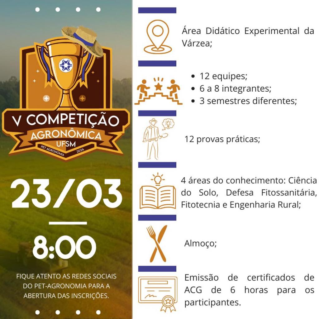 🚀 Atenção alunos da Agronomia – UFSM, no dia 23 de março (sábado) será realizada a V Competição Agronômica na Área Experimental da Várzea!  🌾🌽