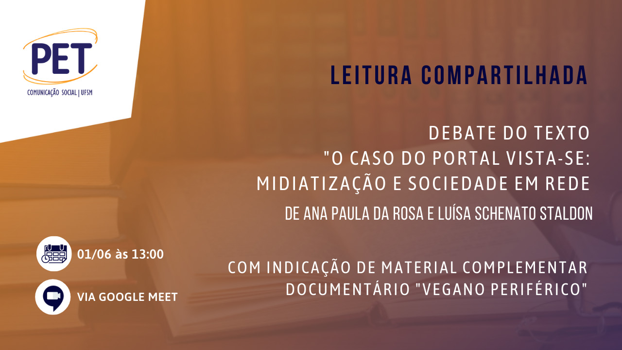 😉 E aí, tudo certo? Quer saber mais sobre a desmistificação do veganismo? Então venha participar da Leitura Compartilhada do PETCom! Vamos conversar sobre o texto “O caso do portal vista-se: Midiatização e sociedade em rede” de Ana Paula da Rosa e Luísa Schenato Staldon. Com a indicação de material complementar documentário “vegano periférico” 🌱