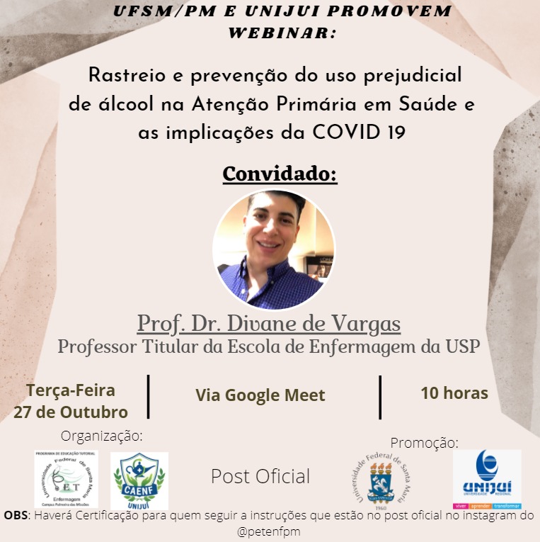 Convidamos a todos para participarem do Webinar: Rastreio e prevenção do uso prejudicial de álcool na Atenção Primária em Saúde e as implicações da COVID 19, promovido em pareceria com a a Turma de Enfermagem da Unijuí, que acontecerá no dia 27 de outubro, às 10:00 horas, com transmissão via Farol UFSM.