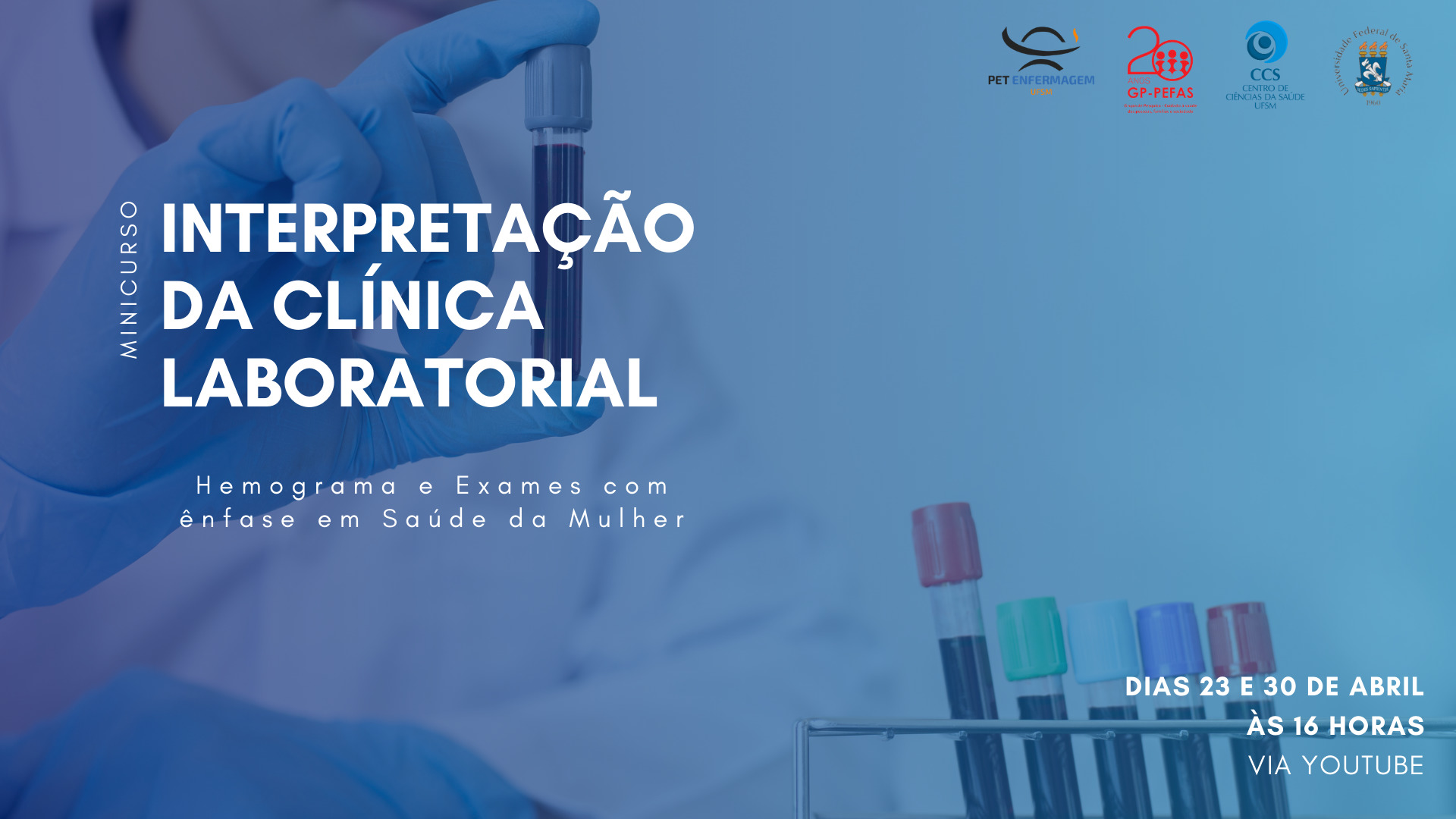 O Minicurso de Interpretação da Clínica Laboratorial: Hemograma e Exames com Ênfase em Saúde da Mulher, está sendo organizado pelo Programa de Educação Tutorial – PET Enfermagem da UFSM em parceria com o Grupo de Pesquisa Cuidado à Saúde das Pessoas, Famílias e Sociedade (PEFAS). O PET Enfermagem é pautado na tríade ensino, pesquisa, extensão e por meio de projetos trabalha com diferentes temáticas e públicos. Um dos projetos do grupo é realizado a fim auxiliar no processo de formação dos acadêmicos de Enfermagem, portanto o grupo promove atividades de ensino a fim de complementar a grade curricular da graduação e promover a aprendizagem por meio da oferta de minicursos e simpósios. Já o Grupo de Pesquisa Cuidado à Saúde das Pessoas, Famílias e Sociedade (GP-PEFAS), vinculado ao Departamento de Enfermagem da Universidade Federal de Santa Maria, contempla um conjunto articulado de projetos de extensão e pesquisa, para subsidiar a prática baseada em evidências, com enfoque nos temas: HIV; violência contra mulher; aleitamento materno; segurança alimentar com enfoque, principalmente, na população de crianças e adolescentes. Assim, a parceria busca trazer tanto de maneira geral a interpretação do hemograma, quanto com enfoque na saúde da mulher. O objetivo do minicurso é auxiliar os acadêmicos da área da saúde, bem como profissionais da área a manterem um conhecimento atualizado acerca dos exames laboratoriais que surgem no cotidiano da clínica.