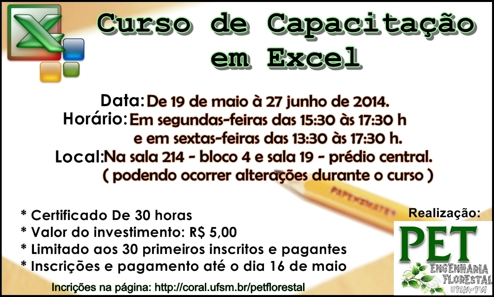As Inscrições estão disponíveis na aba Downloads do site, lembrando que são apenas 30 vagas, e as vagas são preenchidas após o pagamento do curso que será realizado na sala do grupo PET até o dia 16 de maio de 2014.