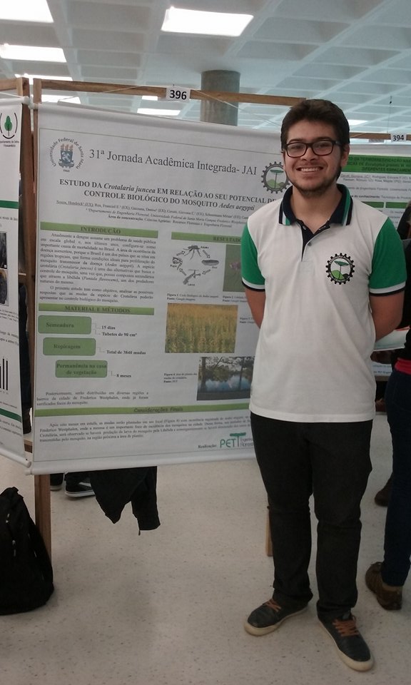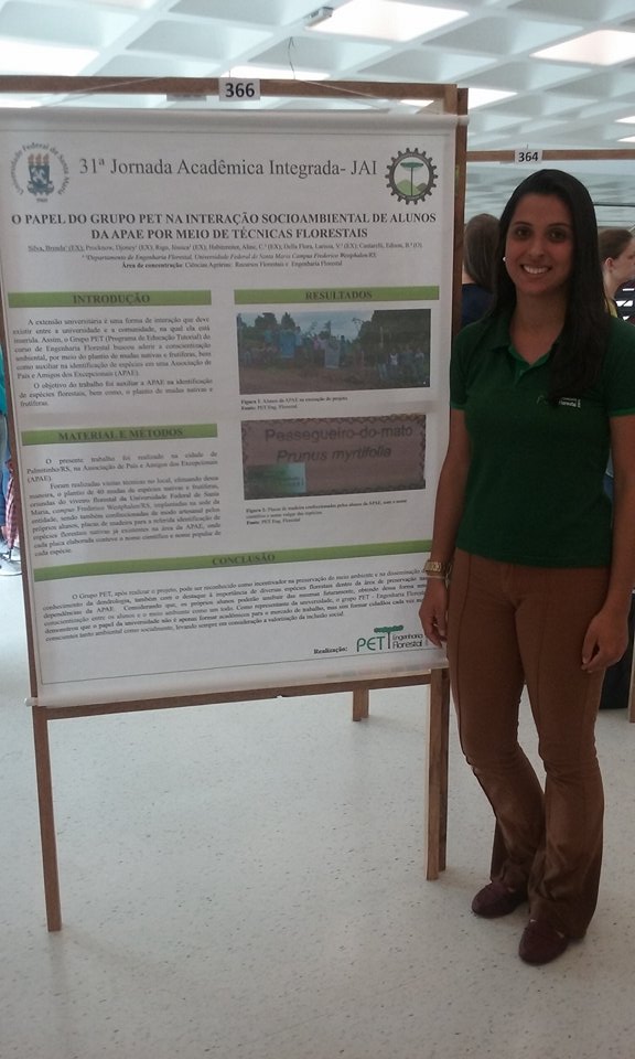 O grupo PET Eng. Florestal marcou a presença na 31ª Jornada Acadêmica Integrada, que ocorreu de 17 a 21 de outubro de 2016, em Santa Maria-RS. Com a exposição de dois banners, um sobre O PAPEL DO GRUPO PET NA INTERAÇÃO SOCIOAMBIENTAL DE ALUNOS Da APAE POR MEIO DE TÉCNICAS FLORESTAIS, e o outro sobre ESTUDO DA CROTALÁRIA JUNCEA EM RELAÇÃO AO SEU POTENCIAL DE CONTROLE BIOLÓGICO DO MOSQUITO AEDES AEGYPTI.