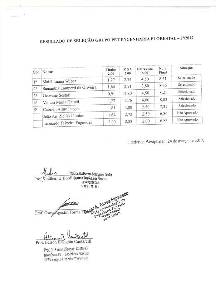 Resultado de Seleção Grupo PET Eng. Florestal-1°/2017