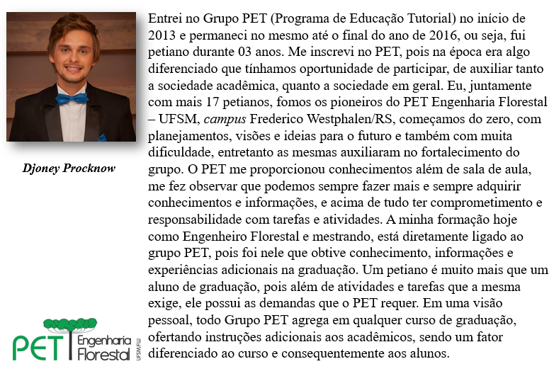 O grupo PET Eng. Florestal com o intuito de mostrar a importância que o grupo tem para alunos em graduação e alunos egressos,  traz os relatos das experiências de SER PETIANO.