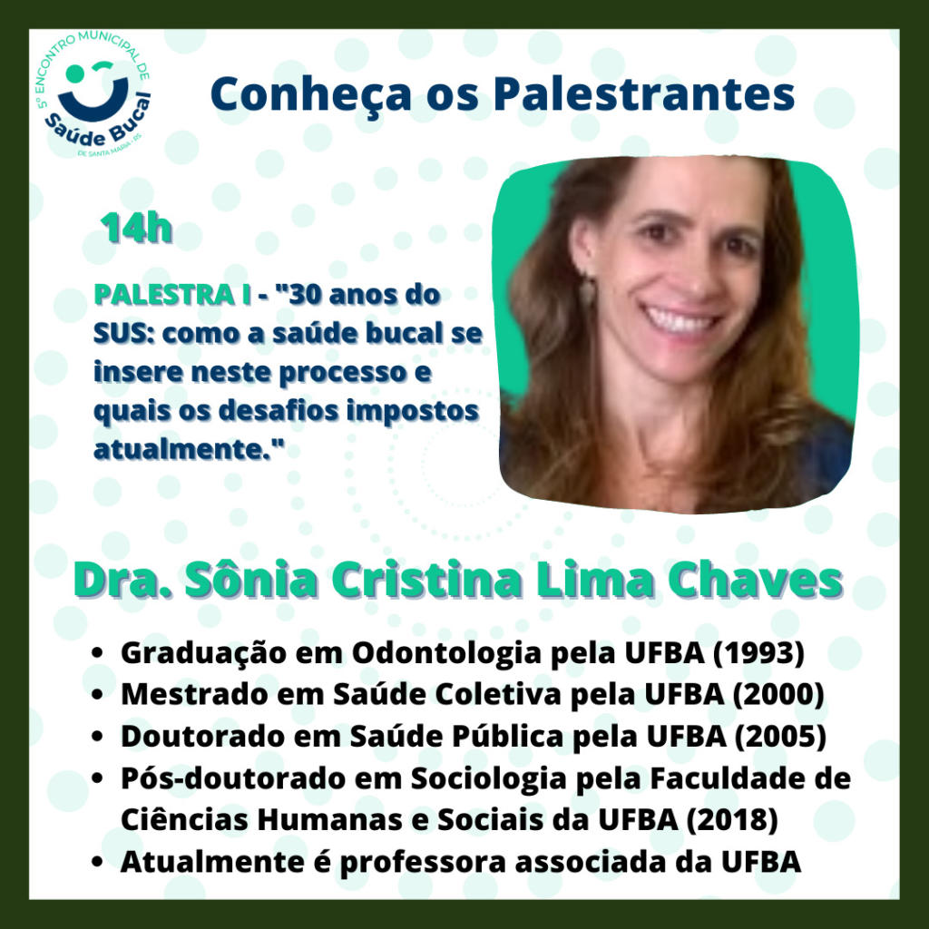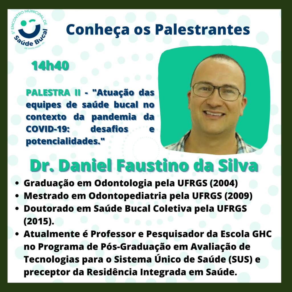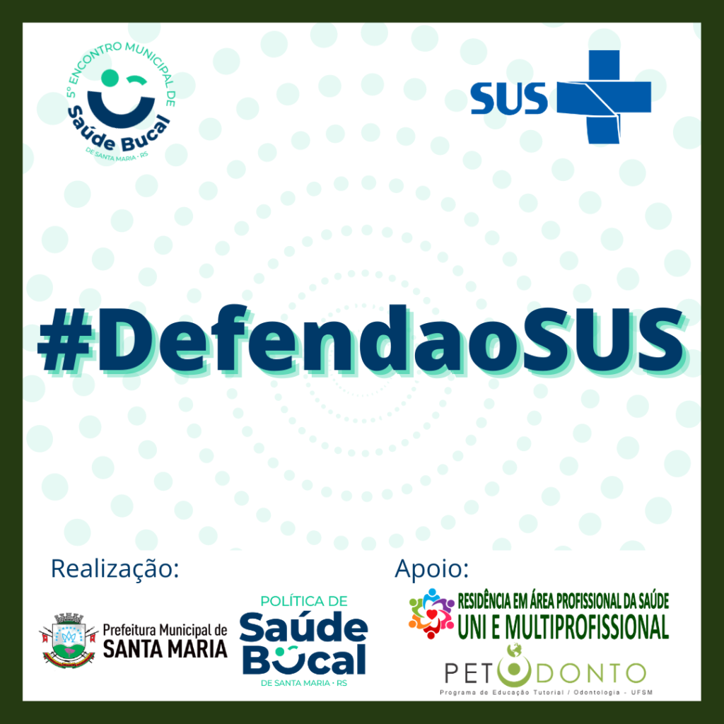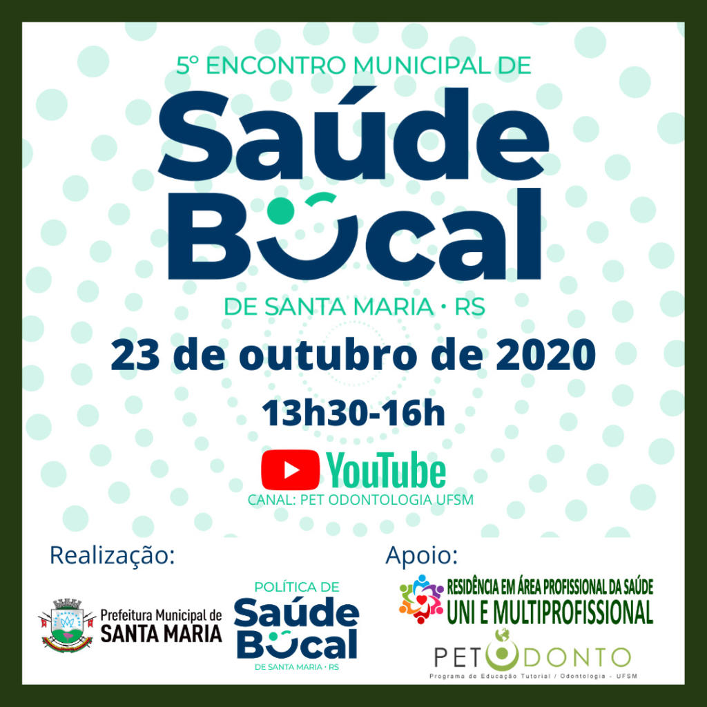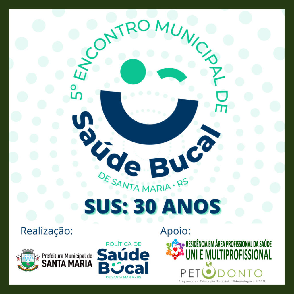 É com bastante alegria que anunciamos que neste ano estamos contribuindo com o 5º Encontro Municipal de Saúde Bucal de Santa Maria-RS, que será promovido pela Política de Saúde Bucal do Município de Santa Maria, com o apoio do Departamento de Saúde Coletiva do Centro de Ciências da Saúde da Universidade Federal de Santa Maria, do Programa de Residência Multiprofissional em Área da Saúde da UFSM e do PET-Odontologia UFSM.