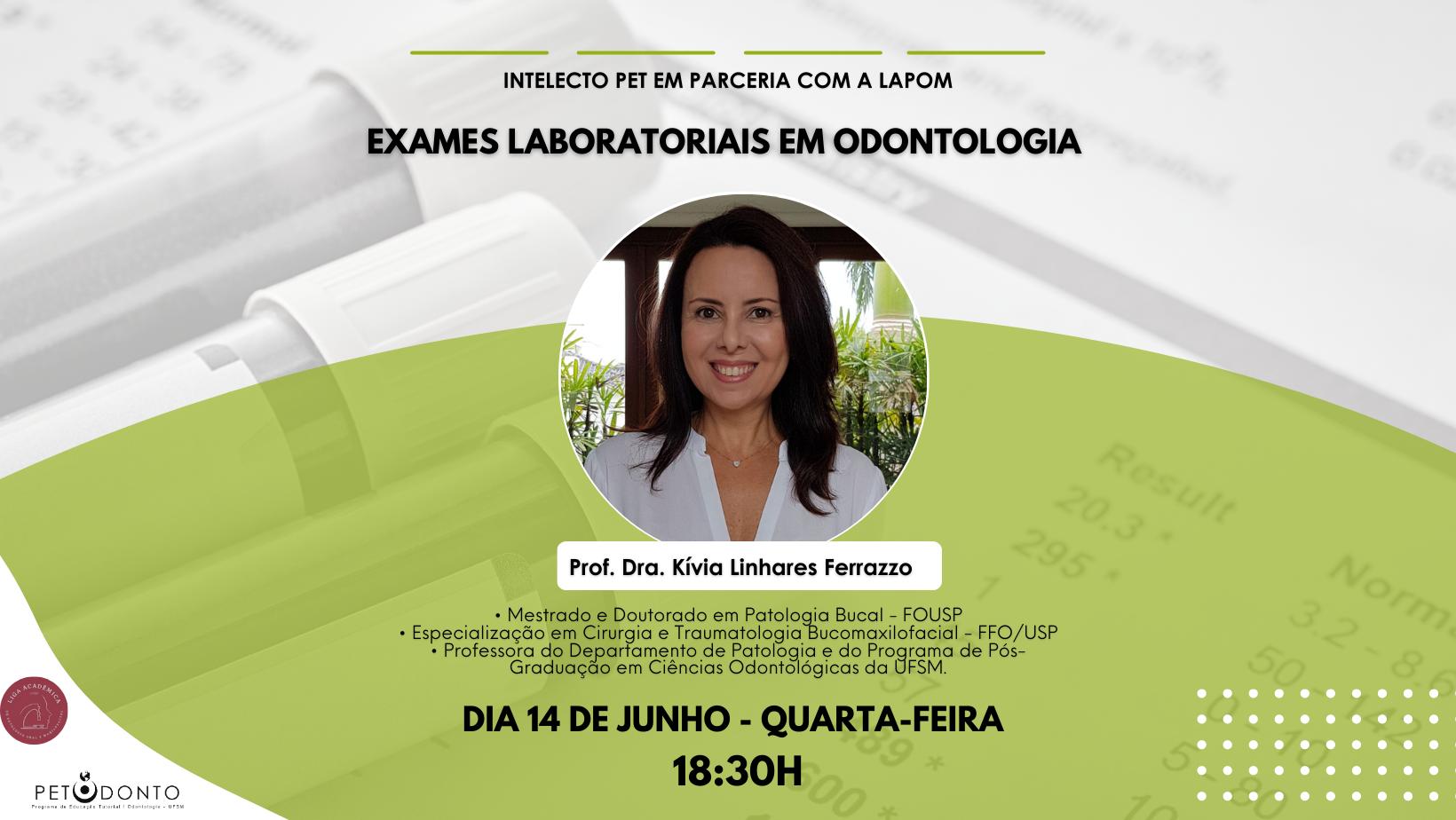 A palestra será sobre “Exames laboratoriais em odontologia” e será ministrada pela Prof. Drª. Kívia Linhares Ferrazzo.