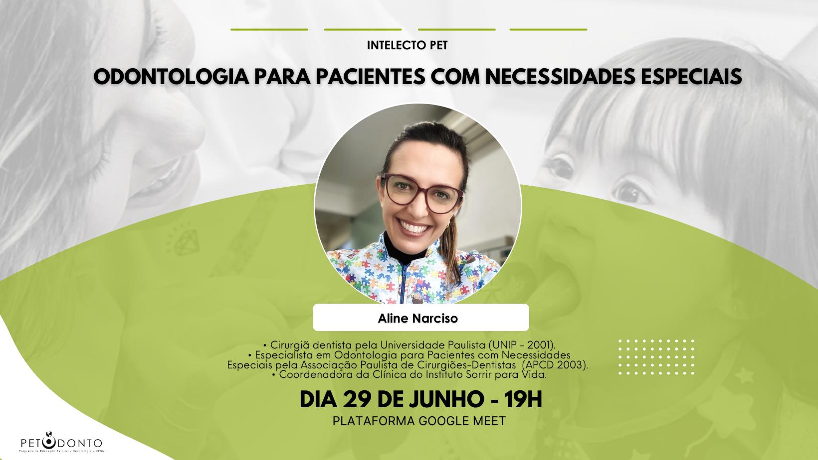 A palestra será sobre “Odontologia para Pacientes com Necessidades Especiais” e será ministrada pela Aline Narciso.