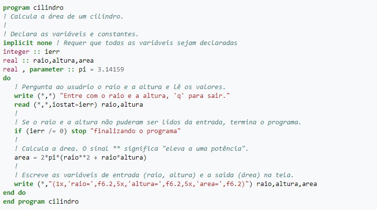 Exemplo do cálculo da área da superfície do cilindro, implementado em Fortran 95: