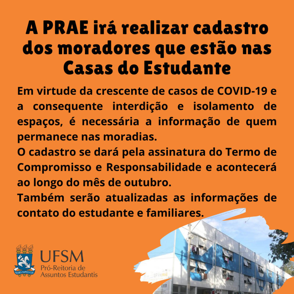 Para ampliar a capacidade de resposta nestas situações, a PRAE irá realizar durante o mês de outubro o cadastramento dos estudantes que permanecem na CEU-I, CEU-II, CEU-III e Moradia Indígena. O cadastro se dará pela assinatura do Termo de Compromisso e Responsabilidade, onde serão atualizadas informações de contato do estudante e familiares.