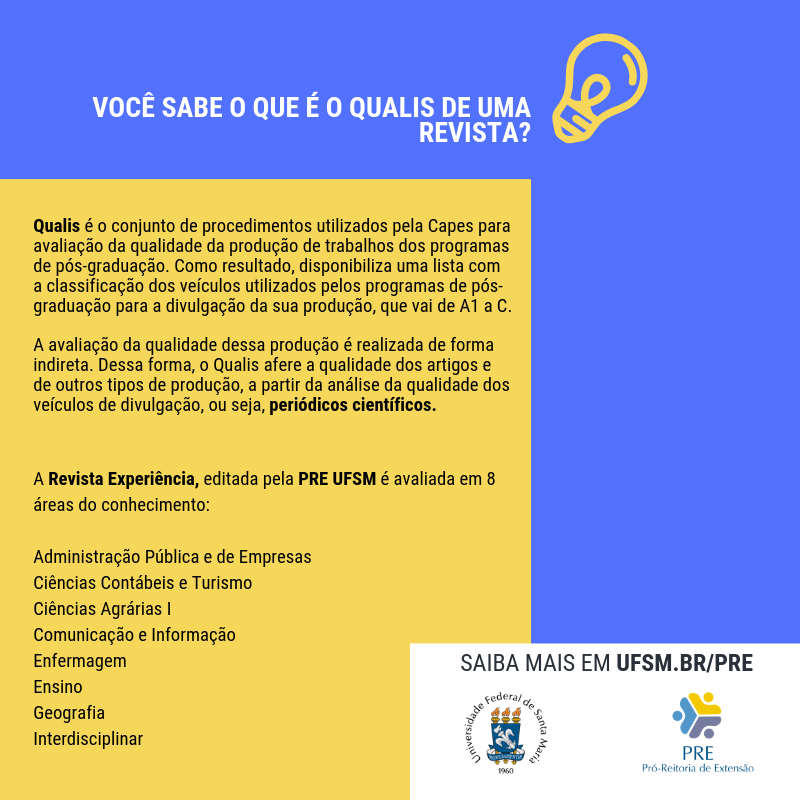 Atualmente, a editora da Revista é a professora Janaína Gomes, do Departamento de Ciências da Comunicação da UFSM campus Frederico Westphalen. Por ser um periódico de fluxo contínuo, é possível submeter trabalhos para as próximas edições. A Revista acolhe relatos de experiência e artigos de alunos, professores e técnicos administrativos extensionistas. Não há taxa de submissão e deve ser um trabalho inédito. Mais informações sobre as normas de publicação e sobre a equipe editorial podem ser acessadas pelo site: periodicos.ufsm.br/experiencia