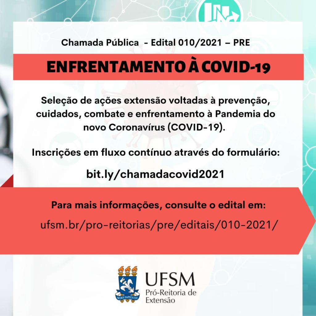 Diante do cenário causado pela pandemia de Covid-19, a Pró-Reitoria de Extensão da UFSM lançou, pelo segundo ano consecutivo, um edital destinado ao fomento de Ações de Extensão que visem à prevenção, ao combate e ao enfrentamento da covid-19 nas regiões de abrangência da Instituição.