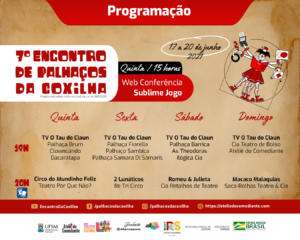 De 17 a 20 de junho, a programação do evento (que neste ano será realizado em formato virtual, por conta das medidas restritivas de prevenção contra a Covid-19) reunirá artistas e pesquisadores da palhaçaria, apresentando ao público espetáculos de circo-teatro e gags produzidas por companhias santa-marienses que se dedicam à investigação e criação no universo da comicidade.
