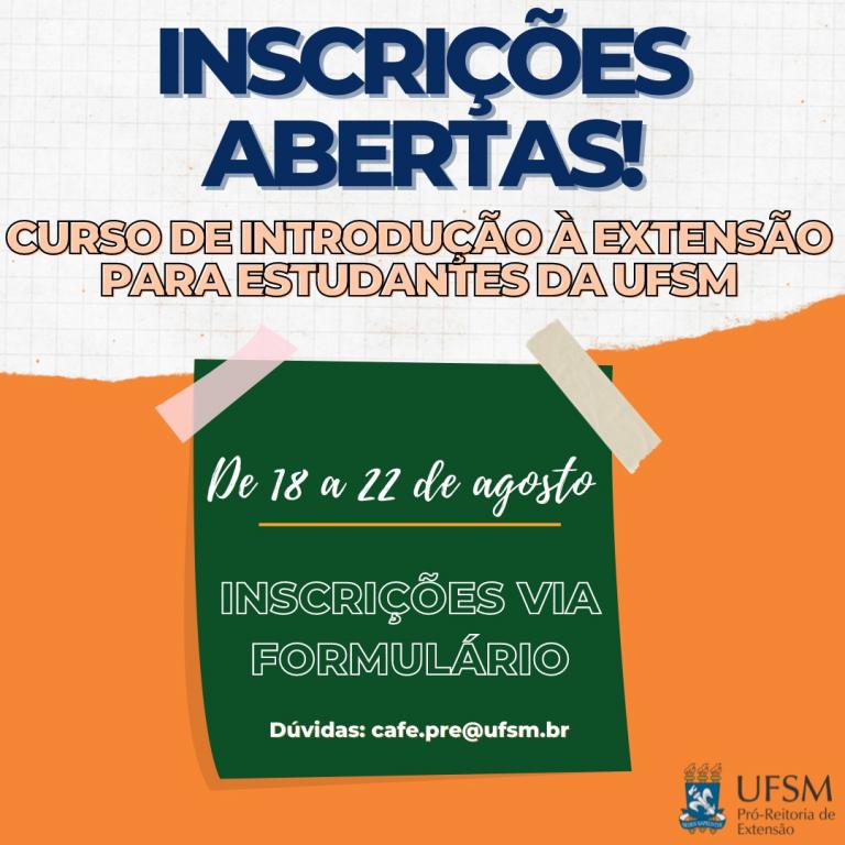 Na última quinta-feira (18), a Pró-Reitoria de Extensão UFSM, por meio da Coordenadoria de Articulação e Fomento à Extensão (CAFE), abriu as inscrições para o Curso de Introdução à Extensão Universitária. A atividade busca capacitar os acadêmicos para a prática de ações extensionistas junto às comunidades de abrangência da Instituição. As inscrições devem ser realizadas até o dia 22 de agosto, mediante formulário eletrônico