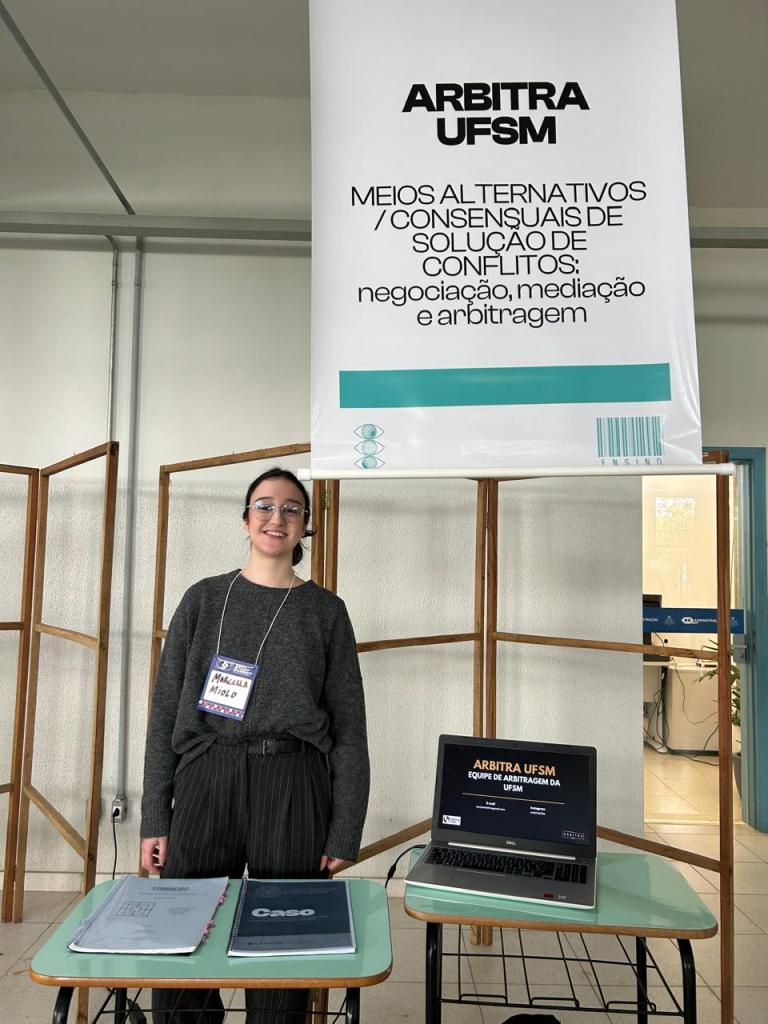 Marcella Miolo, aluna do 8º semestre de Direito e integrante do grupo, explica: “A arbitragem é um meio de resolução de conflitos privados, no qual as partes são consideradas iguais. Por exemplo, uma relação trabalhista não poderia ser resolvida por arbitragem, pois o trabalhador é parte vulnerável e precisa de proteção legal. Já na arbitragem, as partes estão em condição de igualdade, sem a figura de um juiz estatal. O processo é mais leve, flexível e menos formal, especialmente voltado para o Direito Empresarial”.