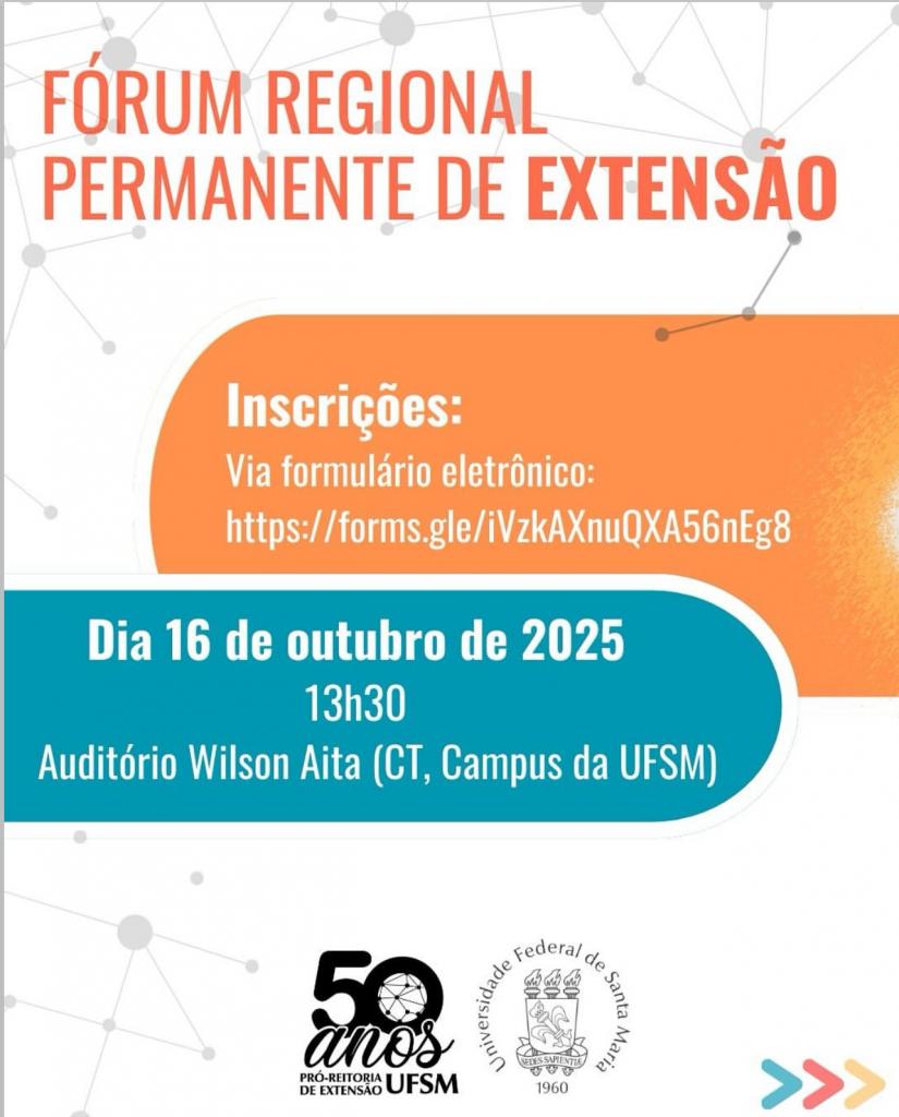Será realizada, no dia 16 de outubro de 2025, mais uma edição do Fórum Regional Permanente de Extensão da Universidade Federal de Santa Maria (UFSM), um evento fixo e permanente da instituição, previsto na Política de Extensão da UFSM. O fórum tem como objetivo ouvir a comunidade interna e externa, avaliar o impacto das ações extensionistas e definir prioridades que orientarão os editais da Pró-Reitoria de Extensão (PRE) para o próximo ano.