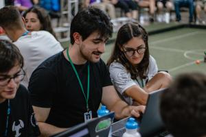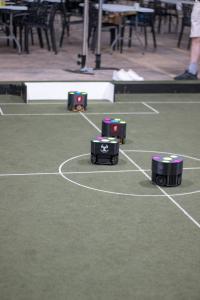 A categoria Small Size League – Entry Level consiste em partidas de futebol de robôs totalmente autônomos, nas quais times formados por três robôs competem entre si em uma dinâmica semelhante ao futebol tradicional. Os robôs — pequenos veículos com rodas capazes de se deslocar, driblar e chutar a bola — recebem comandos a partir de um sistema de visão computacional. Uma câmera instalada acima do campo identifica a posição de cada robô e da bola, enquanto um software processa essas informações e envia, via rádio, instruções de movimento e tomada de decisão. “Os robôs jogam sozinhos. A partir do momento em que a partida começa, ficamos apenas assistindo”, explicaram os integrantes. Com dois tempos de cinco minutos e regras específicas, como faltas, substituições e pedidos de time out, a competição exige precisão técnica, estratégia e controle rigoroso do comportamento dos robôs durante as partidas.