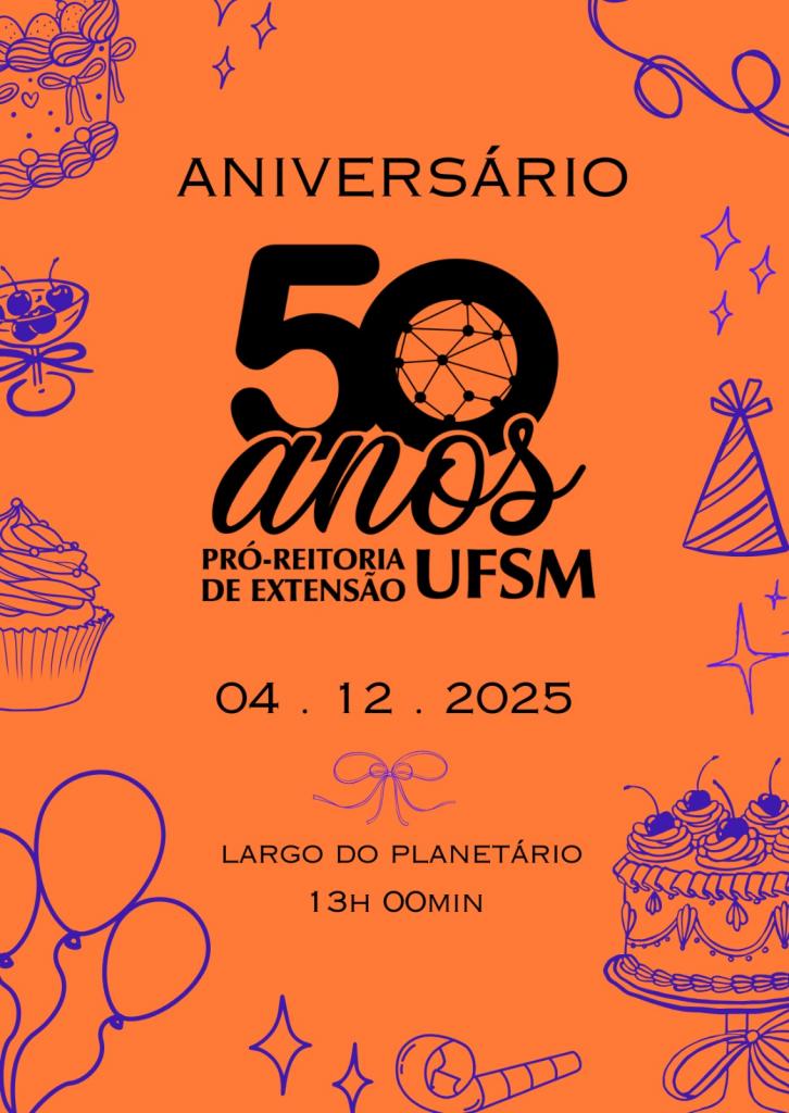A Pró-Reitoria de Extensão da UFSM convida toda a comunidade acadêmica para celebrar um marco significativo: 50 anos de Extensão Universitária dedicados ao diálogo, à integração social e ao compromisso público da Universidade com a sociedade.