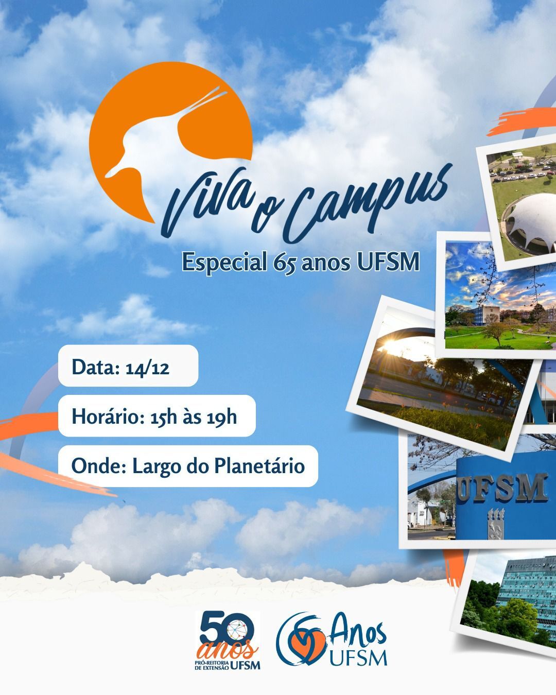 A Universidade Federal de Santa Maria, por meio da Pró-Reitoria de Extensão UFSM, através da Coordenadoria de Cultura e Arte, promove, neste domingo, 14 de Dezembro, o Viva o Campus de aniversário de 65 anos da UFSM. O evento faz parte de uma programação de ações de toda a universidade, as quais vêm sendo realizadas ao longo desse mês. As atividades são abertas a toda comunidade e acontecem das 15h às 19h.