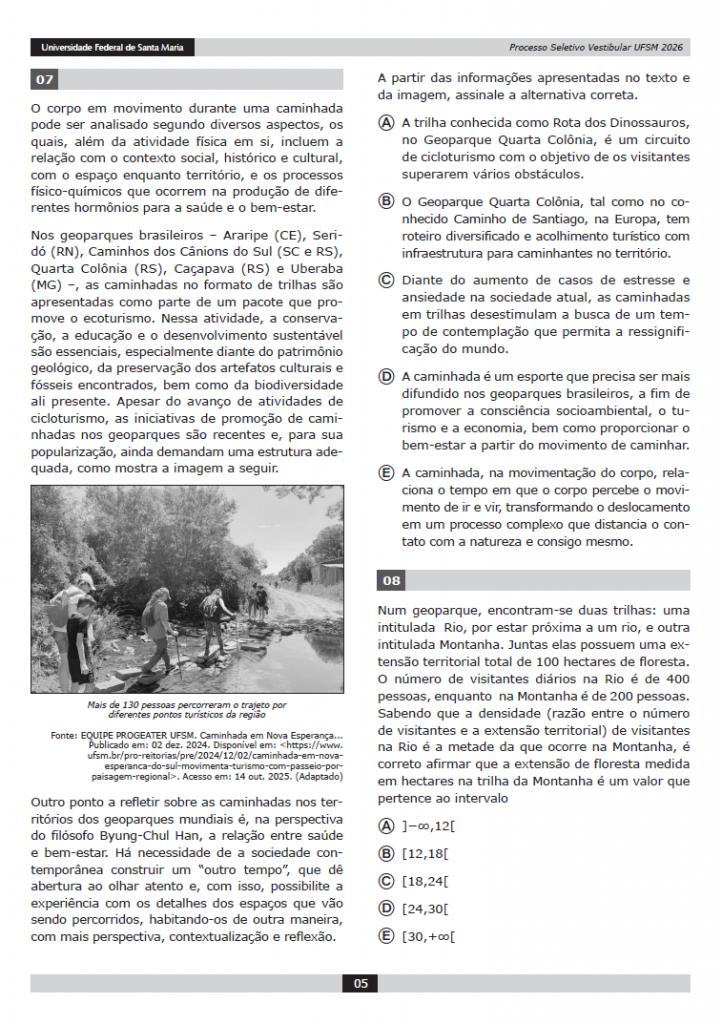 Ao abordar o corpo em movimento, a relação com o território, o patrimônio cultural e geológico, o bem-estar e a saúde, a questão do vestibular dialoga diretamente com a proposta da Caminhada Internacional na Natureza: promover experiências que integrem educação, turismo, extensão rural, conservação ambiental e fortalecimento comunitário. Nesse sentido, a alternativa correta da prova reforça a caminhada como uma prática capaz de promover consciência socioambiental, dinamizar a economia local e contribuir para a qualidade de vida, ou seja, exatamente os pilares que sustentam o projeto na região.