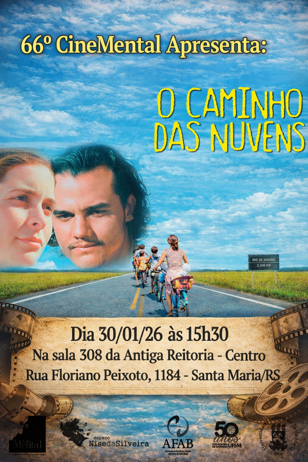 Nesta sexta-feira (30), às 15h30, a sala 308 da Antiga Reitoria da UFSM será palco de mais uma edição do CineMental, que chega ao seu 66º encontro reafirmando o cinema como ferramenta de sensibilização, reflexão e diálogo coletivo. A atividade contará com a exibição do filme brasileiro O Caminho das Nuvens (2003), seguida de uma roda de conversa aberta ao público.
