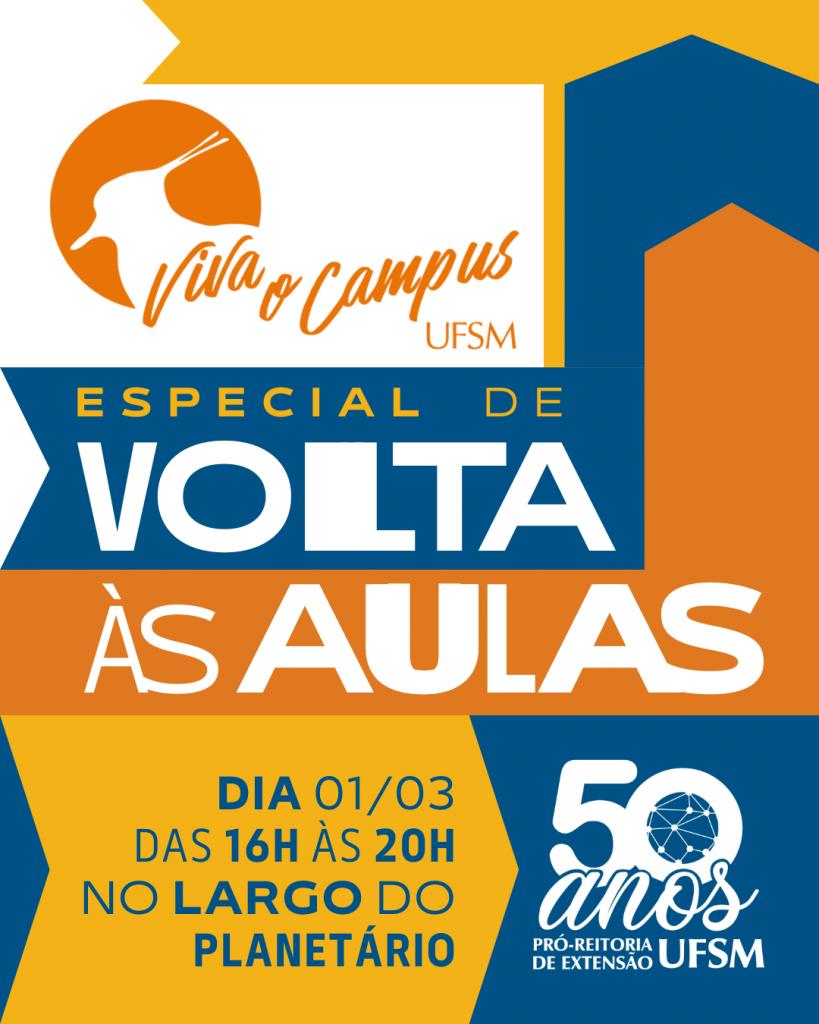 A Universidade Federal de Santa Maria, por meio da Pró-Reitoria de Extensão UFSM, através da Coordenadoria de Cultura e Arte, promove, neste domingo, 01 de Março, o Viva o Campus Volta às Aulas. O evento é o primeiro de 2026 e vai recepcionar os alunos para o início do ano letivo. As atividades são abertas a toda comunidade e acontecem das 16h às 20h.