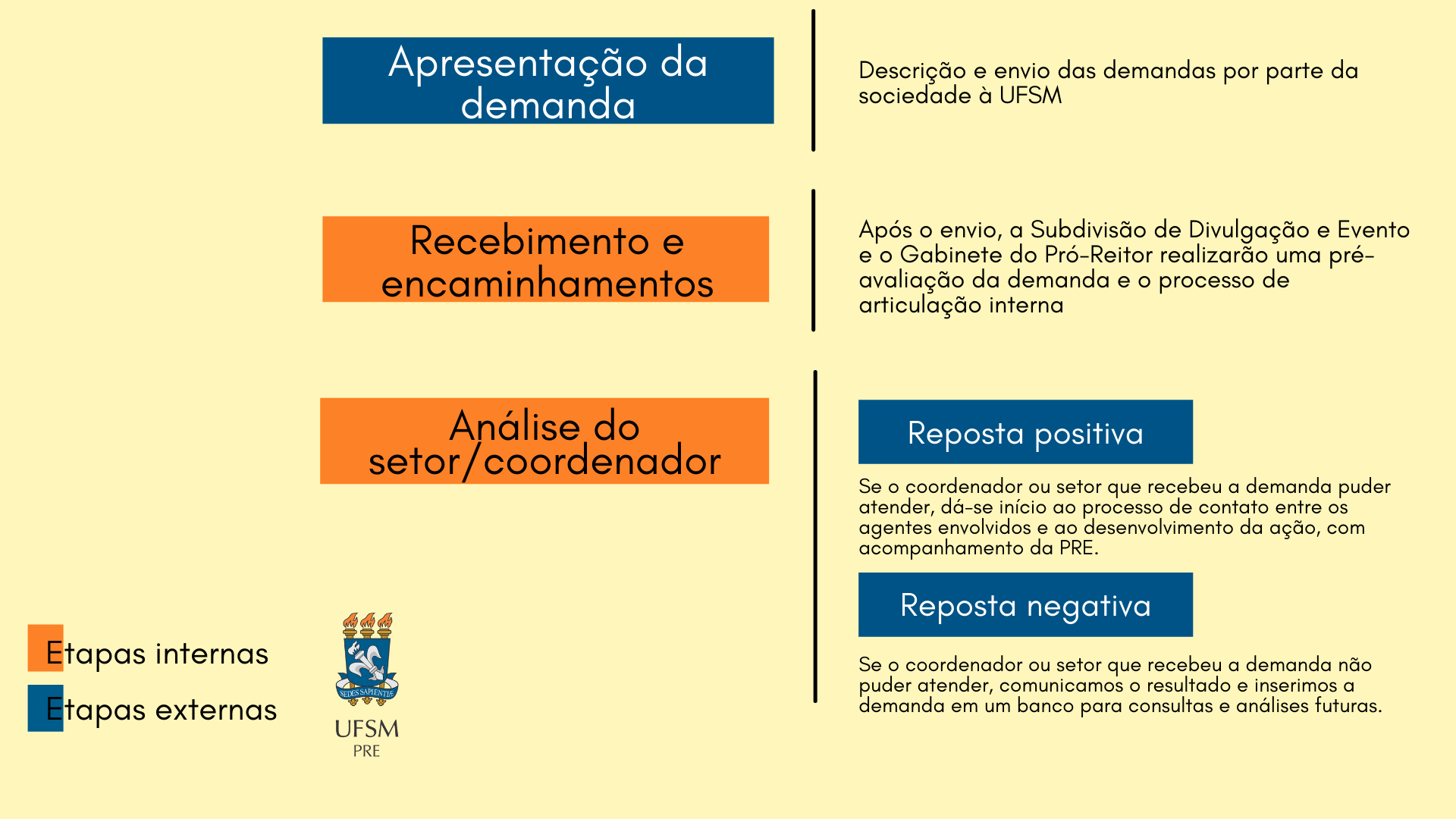 Após a apresentação da demanda por parte da sociedade, os dados serão analisados e encaminhados aos setores responsáveis por intermédio da Pró-Reitoria de Extensão. A seleção dos coordenadores e dos setores aos quais serão encaminhados os pedidos é realizada pelo Gabinete do Pró-Reitor e pela Subdivisão de Divulgação e Eventos. Recebida a resposta do coordenador, a UFSM entrará em contato com o demandante para apresentar o resultado da avaliação.