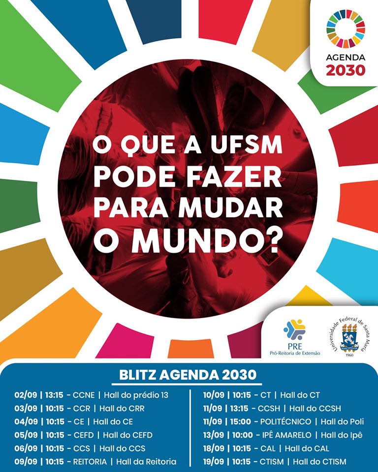 Serão realizadas blitz de divulgação em todas Unidades de Ensino do campus sede com coleta de sugestões da comunidade acadêmica sobre o que a Universidade Federal de Santa Maria pode fazer para tornar o mundo melhor para se viver. Confira, abaixo, os dias e horários da blitz.