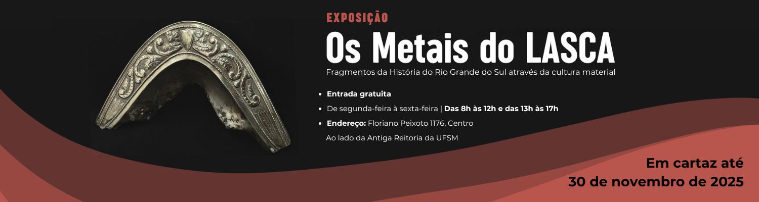 A Exposição “os Metais do LASCA: Fragmentos da História do Rio Grande do Sul através da cultura material” traz ao público uma pequena parte do acervo em metal do Laboratório de Arqueologia, Sociedades e Culturas das Américas. Este acervo é o resultado de diversas atividades de escavação e coleta arqueológica ao longo dos 40 anos de existência de projetos de Arqueologia na UFSM.