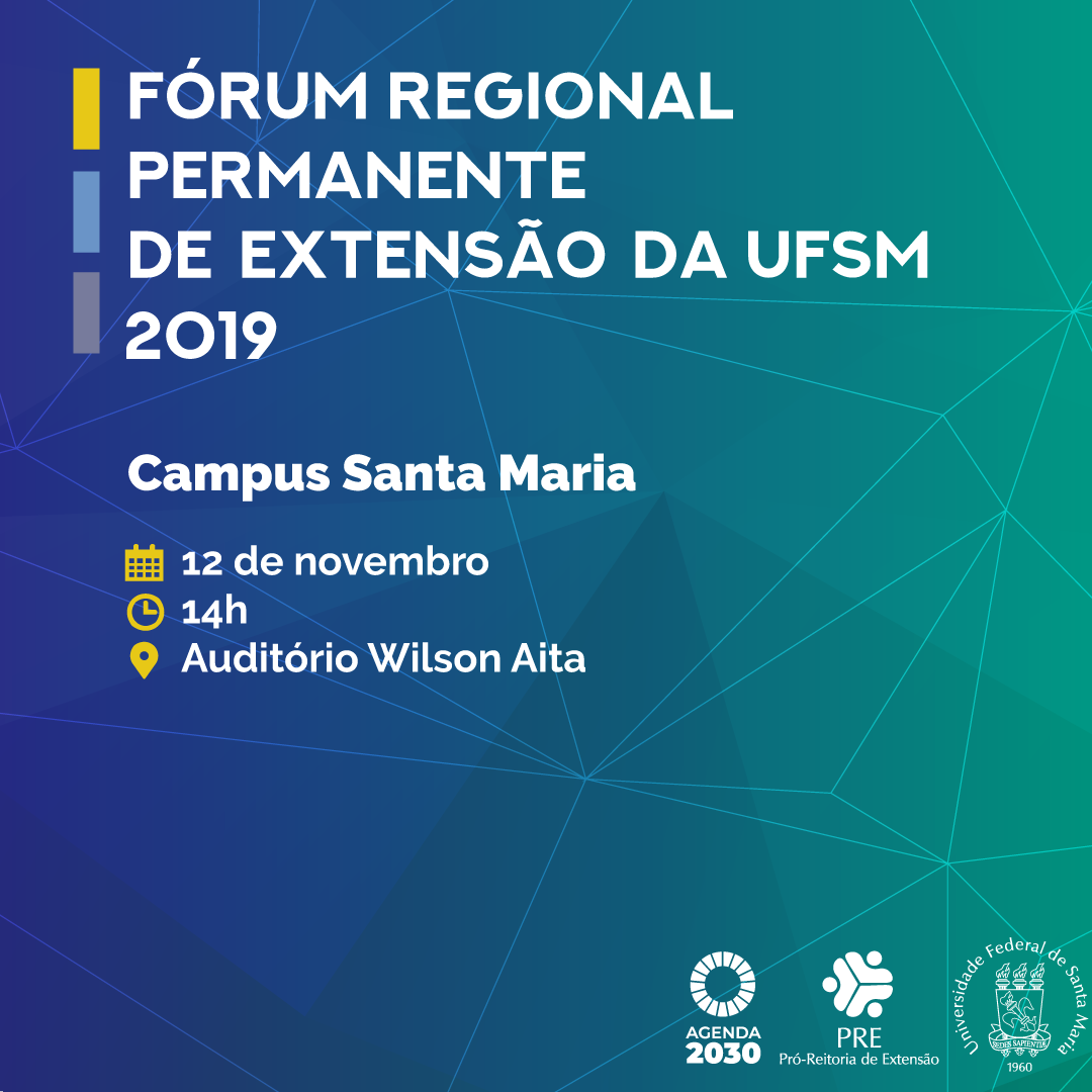 A Pró-Reitoria de Extensão (PRE), com o objetivo de coletar e atender as demandas das comunidades nas quais está inserida, realiza a segunda edição de 2019 do Fórum Regional Permanente de Extensão. O evento é aberto a toda comunidade regional das cidades-sede da UFSM.