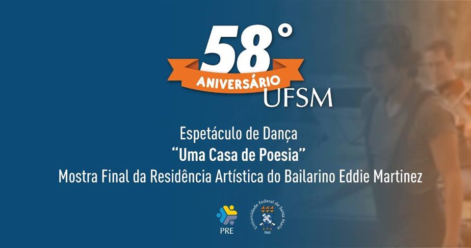 A última atração da semana comemorativa dos 58 anos da Universidade Federal de Santa Maria será a Mostra Final da Residência Artística do bailarino Eddie Martinês, a qual foi realizada na sala de ensaios do Centro de Convenções durante um mês, resultando no espetáculo de dança “Uma Casa de Poesia” !!