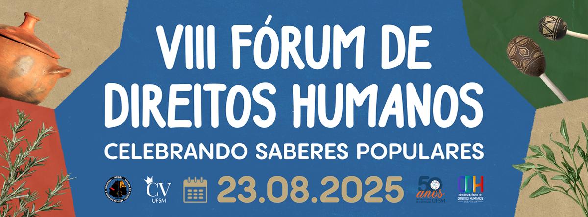 O Observatório de Direitos Humanos da UFSM, vinculado à Pró-Reitoria de Extensão da UFSM, promove a VIII Fórum de Direitos Humanos da UFSM, que será realizado no dia 23 de agosto de 2025, das 14h às 17h, na Antiga Reitoria da UFSM. Com o tema “Celebrando Saberes Populares”, o evento tem como proposta promover o diálogo, a valorização e a visibilidade dos saberes populares como expressões legítimas de conhecimento, cultura e resistência. A programação contará com roda de conversa, oficinas, feira popular, mostra cultural e exposição das ações desenvolvidas pelos grupos envolvidos, fortalecendo a construção coletiva dos direitos humanos por meio de práticas educativas e culturais que reconhecem a diversidade, a memória e a luta das comunidades tradicionais e periféricas. Participe desse momento de encontro, celebração e reconhecimento dos saberes que constroem e transformam o nosso território!