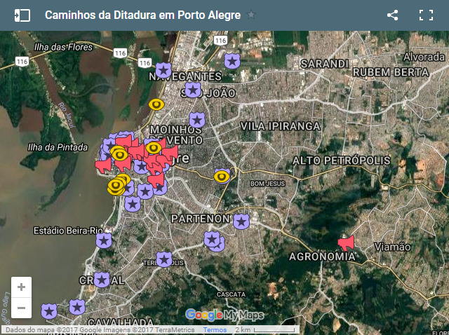 Conheça o mapa “Caminhos da Ditadura em Porto Alegre”, trabalho desenvolvido com intuito de abordar esta temática na educação básica, a partir do uso de tecnologias de comunicação e informação. O mapa se divide em quatro categorias: locais de repressão, memória da repressão, locais de resistência e da memória da resistência. Dessa forma o mapa tem como objetivo pensar a cidade de Porto Alegre no contexto da ditadura civil-militar brasileira, aproximando esse tema do cotidiano dos estudantes que por vezes transitam pela capital sem saber das diversas histórias que perpassam este espaço urbano. O mapa se constitui em um recurso importante no auxílio aos professores para tratar de um tema sensível bem como para o conhecimento dos estudantes sobre o patrimônio e a memória da cidade de Porto Alegre.