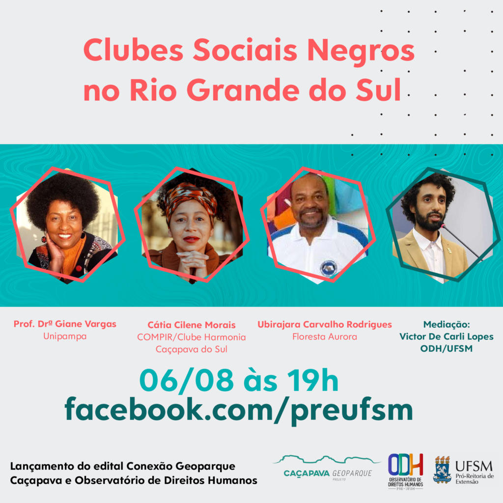 Visando gerar debate e promover discussões sobre as importantes questões do Movimento Negro, o Observatório de Direitos Humanos da UFSM, junto da Pró-Reitoria de Extensão (PRE), irá realizar, na próxima quinta-feira, dia 6, às 19h, uma live chamada “Clubes Sociais Negros no Rio Grande do Sul”.