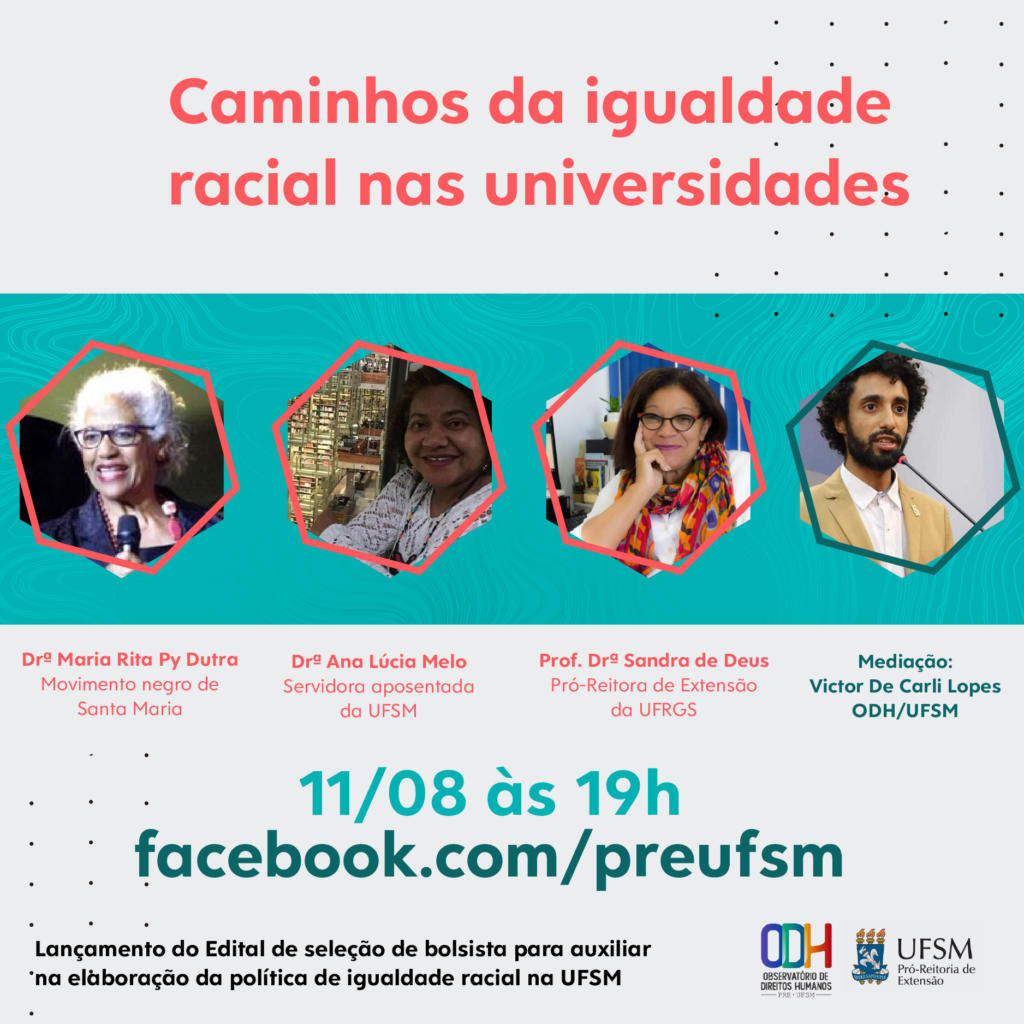 O Observatório de Direitos Humanos da UFSM, junto à Pró-Reitoria de Extensão (PRE), segue promovendo atividades sobre o Movimento Negro na sociedade. Na próxima terça-feira, dia 11, às 19h, ocorrerá uma live intitulada “Caminhos da Igualdade Racial nas Universidades”.