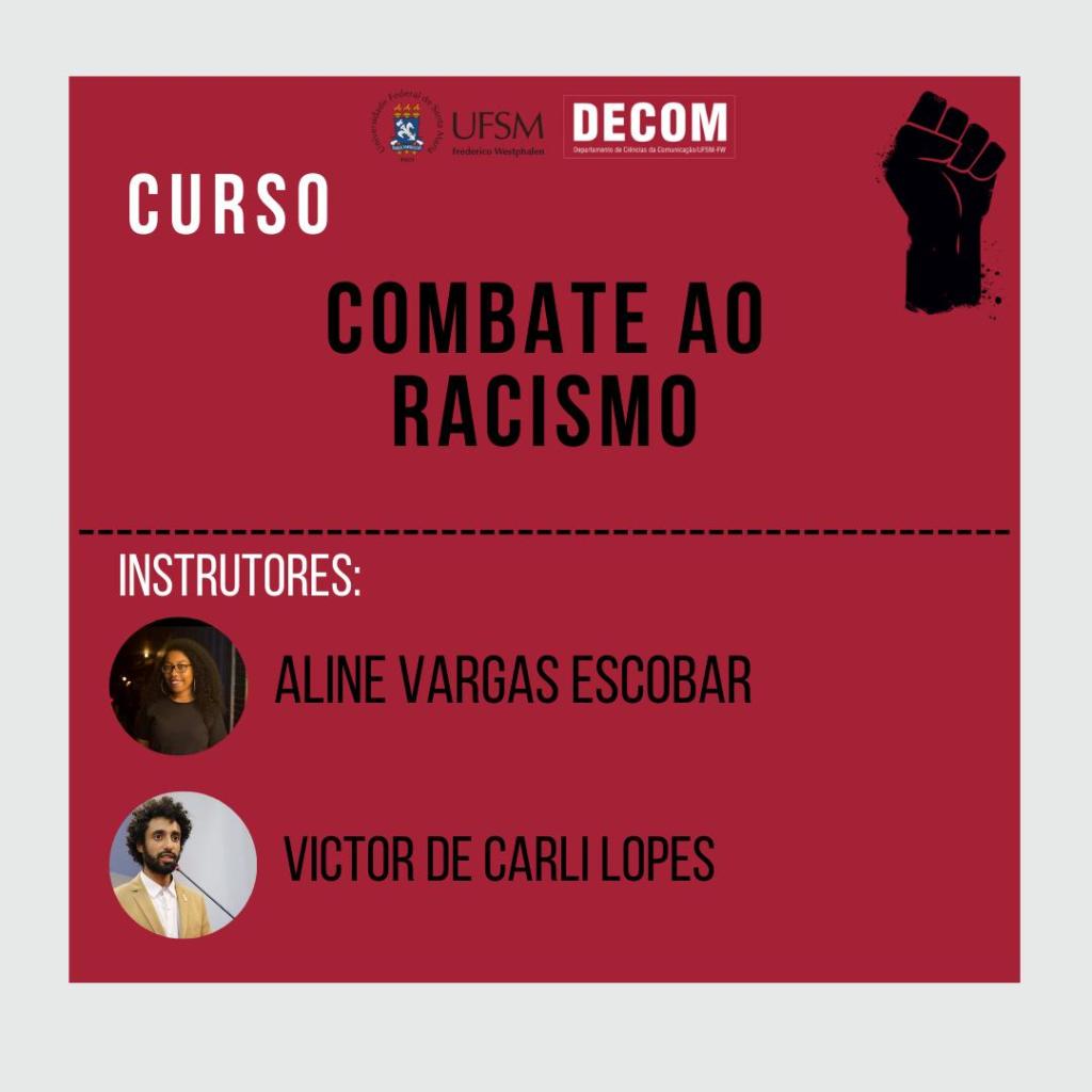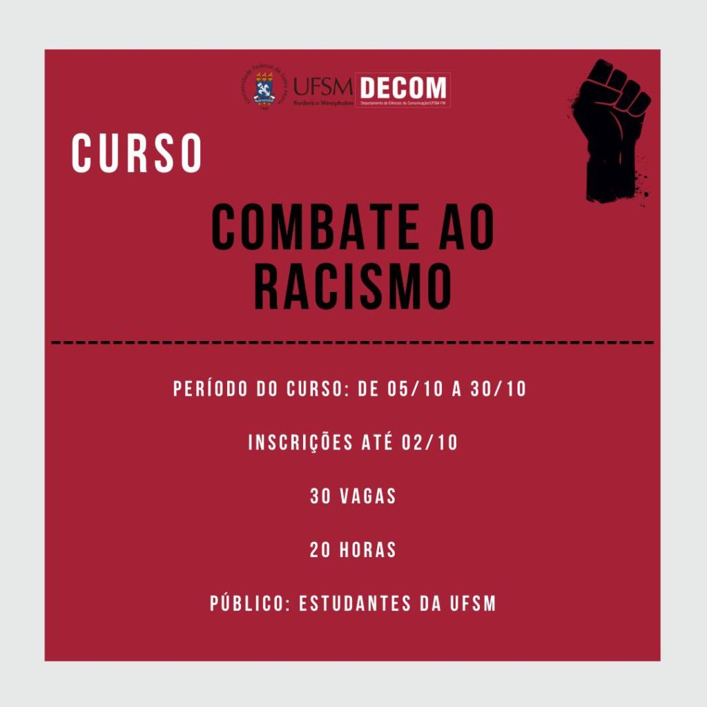 Já estão abertas as inscrições para o Curso Combate ao Racismo! Já ofertado anteriormente em três edições para servidores da UFSM, o curso, agora, também será disponibilizado aos estudantes da Instituição. Visando a sensibilizar a comunidade acadêmica sobre os debates em torno do racismo e suas várias formas de manifestação, gerando, assim, ferramentas que facilitem seu enfrentamento, o curso irá trabalhar assuntos como a definição de racismo, dados sobre o tema no Brasil, ações afirmativas, movimento negro e feminismo negro. O curso, além de buscar fazer com que os estudantes entendam a estruturação do racismo e da desigualdade racial no Brasil, proporciona que conheçam as principais referências, personalidades e teóricos do movimento negro nacional. Realizado em parceria com o Departamento de Comunicação da UFSM de Frederico Westphalen, com o Programa Mão na Mídia e com o Observatório de Direitos Humanos da UFSM, o projeto incentiva a difusão de discussões e iniciativas antirracistas na comunidade acadêmica e na sociedade como um todo.